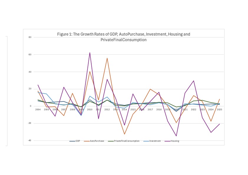 ภาวะเช่นนี้ มีส่วนสัมพันธ์กับตัวแปรเศรษฐกิจอื่น ๆ ด้วยดังแสดงใน Figure 1 การซื้อที่อยู่อาศัยกับรถยนต์มีความสัมพันธ์กันชัดเจนและมีขนาดความผันผวนสูงเหมือนกัน ตัวแปร 2 ตัวข้างต้นยังมีความสัมพันธ์กับการลงทุน ซึ่งจะส่งผลกระทบต่อไปถึงอัตราการขายตัวทางเศรษฐกิจ แต่ว่าความผันผวนของจีดีพีกับการลงทุนจะน้อยกว่าตัวแปรทั้งสองข้างต้นเป็นอย่างมาก พฤติกรรมเช่นนี้อาจอนุมานได้ว่า การซื้อที่อยู่อาศัยกับรถยนต์ขึ้นอยู่กับภาวะเศรษฐกิจและรายได้เป็นอย่างมากและได้รับผลกระทบในขนาดที่มาก ในทางตรงกันข้าม การเปลี่ยนแปลงของรายได้ในทางลบก็จะทำให้ผู้บริโภคหยุดการซื้อที่อยู่อาศัย/รถยนต์ในทันทีเช่นเดียวกันและมีขนาดที่รุนแรง ถ้าจะกล่าวเป็นภาษาชาวบ้านก็คือ ที่อยู่อาศัย/รถยนต์ เป็นของไม่จำเป็นถ้าจะตัดก็ตัดได้ทันที ในขณะเดียวกันรายได้ที่ดีขึ้นก็จะกระตุ้นให้ผู้บริโภคซื้อสินค้าสองอย่างนี้ทันที ในทางเศรษฐศาสตร์ อาจกล่าวได้ว่า สำหรับคนไทยแล้ว permanent income เป็น function ของรายได้ระยะสั้นมาก ๆ จึงเกิดพฤติกรรมดังที่แสดงใน Figure 1