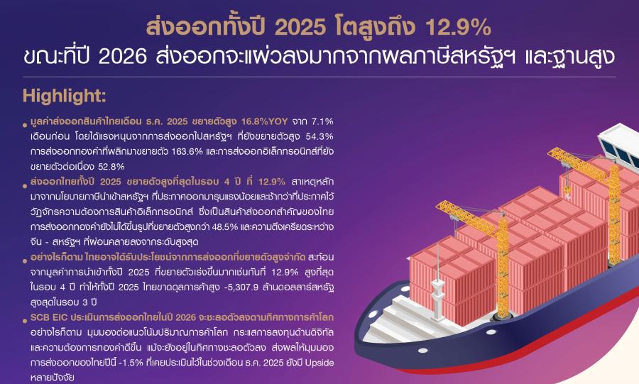 ส่งออกทั้งปี 2025 โตสูงถึง 12.9% ขณะที่ปี 2026 ส่งออกจะแผ่วลงมากจากผลภาษีสหรัฐฯ และฐานสูง