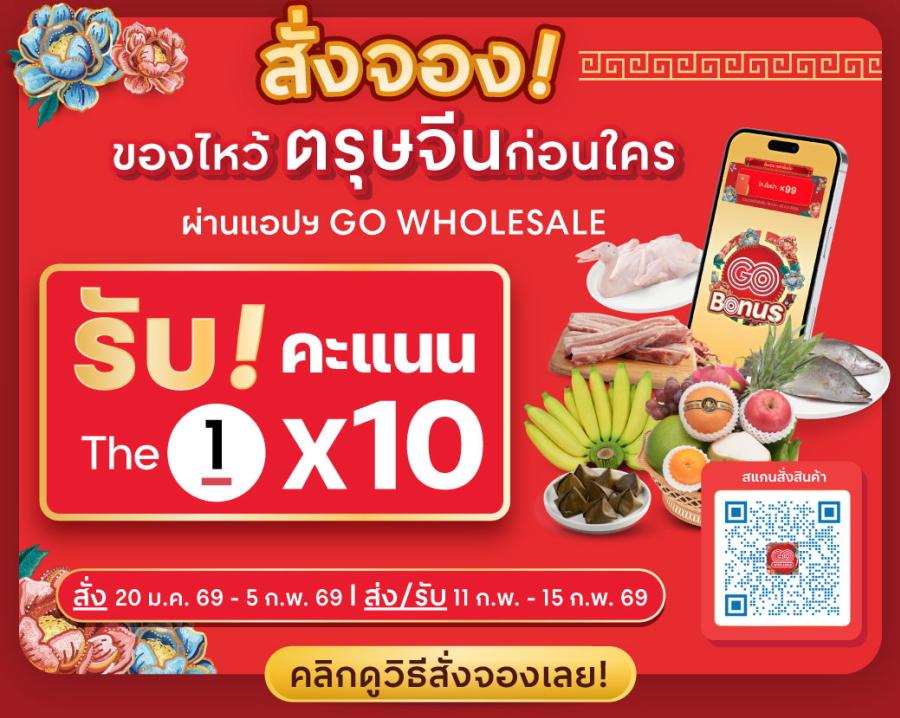 ที่สำคัญ โก โฮลเซลล์ เปิดบริการพรีออเดอร์ รับสั่งของล่วงหน้า เพิ่มความสะดวกและเตรียมความพร้อมก่อนวันไหว้ ผ่านแอปฯ GO WHOLESALE รับคะแนน The1 X10 เริ่มสั่งซื้อตั้งแต่วันนี้ถึง 5 กุมภาพันธ์ 2569 พร้อมรับสินค้าในวันที่ 11 – 15 กุมภาพันธ์ 2569 ซึ่งมีวัตถุดิบที่ใช้ในเทศกาลตรุษจีนแบบ สด ครบ คุ้ม ทั้งอาหารสด อาหารแห้ง อาหารแช่แข็ง ผัก ผลไม้ และชุดเครื่องไหว้ต่างๆ