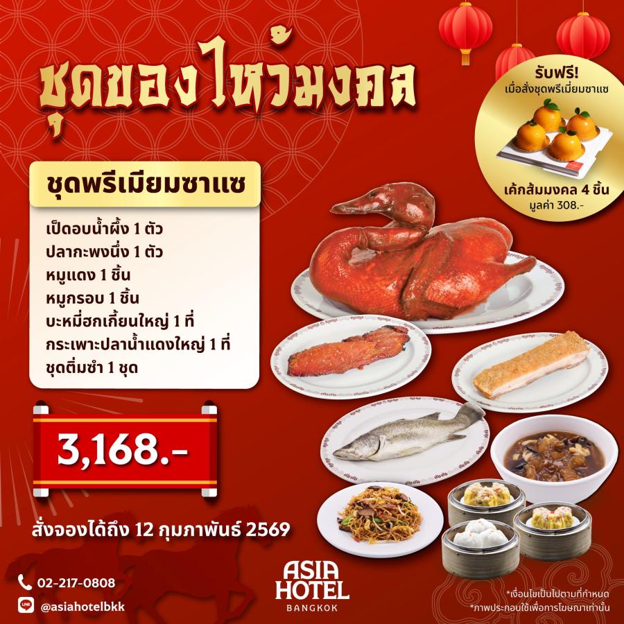 ตรุษจีนปีนี้ของไหว้ต้องเริ่ด! บมจ. เอเชีย โฮเต็ล (ASIA) จัดเซ็ตของคาวหวานครบสูตรมงคล!! รังสรรค์โดยเชฟมืออาชีพจากวัตถุดิบชั้นเลิศ มีให้เลือกทั้ง พรีเมียมซาแช ราคา 3168 บาท และ ชุดซาแซ 1888 บาท เปิดกล่องมาเจอทั้งเป็ดอบน้ำผึ้ง หมูแดง หมูกรอบ ปลากะพง... ยังไม่หมดแค่นั้นเพราะยังมีของหวานมงคลความหมายดีอย่าง เค้กส้มมงคล ขนมทองก้อน ซิ่วท้อ และขนมปุยฝ้าย เห็นแค่รายชื่อก็รู้สึกเฮงแล้ว!....ใครไม่อยากพลาด แนะนำให้รีบจองก่อน 12 กุมภาพันธ์นี้ โทร. 02-217-0808 หรือ LINE : @asiahotelbkk สามารถรับของช่วง 13–16 กุมภาพันธ์ 2569 ที่ ห้องอาหารแอมเบอร์ ชั้น 1 โรงแรมเอเชีย กรุงเทพ.....งานนี้นอกจากเสริมสิริมงคลให้ลูกค้าแล้ว ยังเป็นอีกหนึ่งกลยุทธ์สร้างรายได้ช่วงตรุษจีน เรียกว่าเฮงทั้งคนไหว้ และปังทั้งยอดขายเลยคร้าา