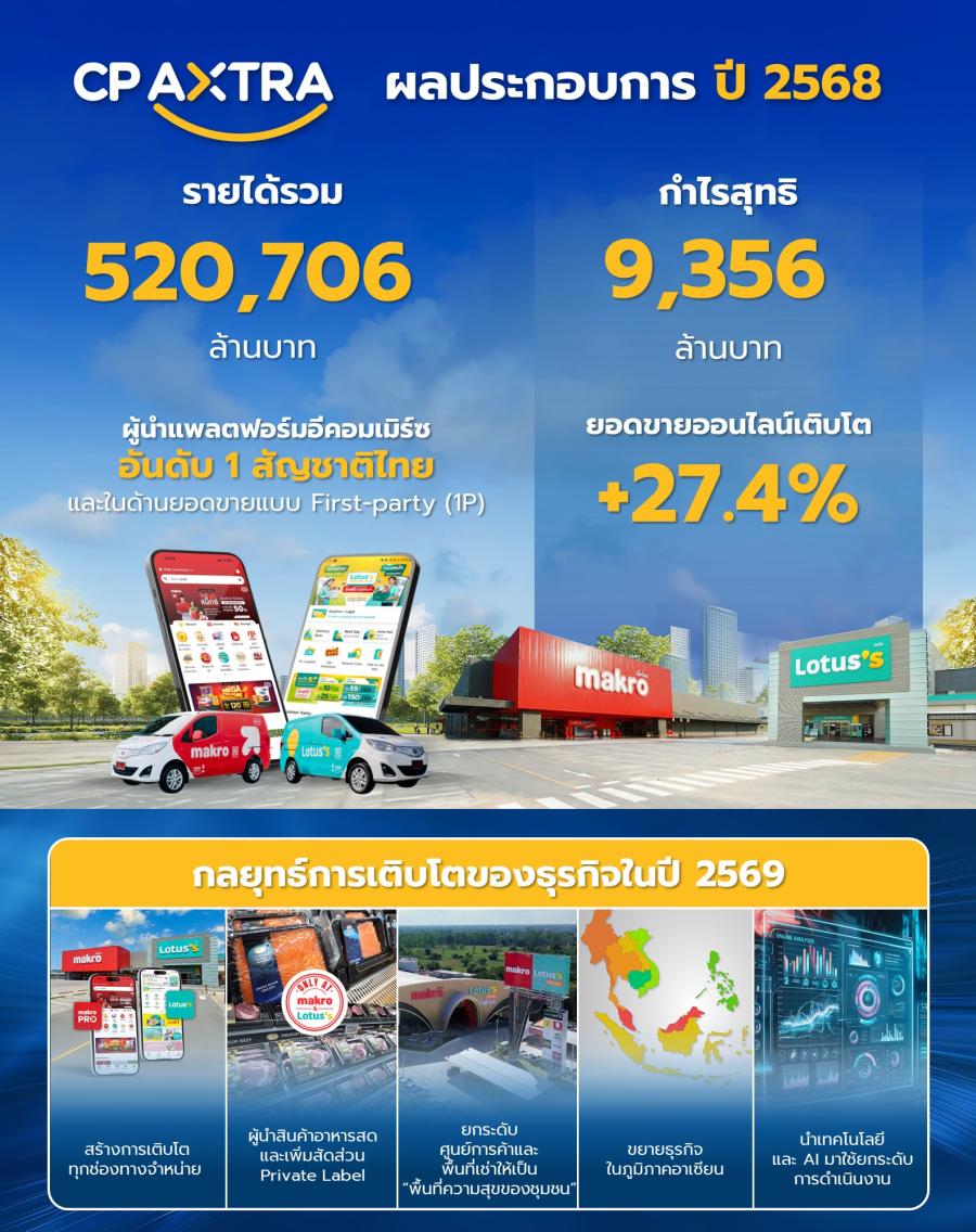 บริษัท ซีพี แอ็กซ์ตร้า จำกัด (มหาชน) (บริษัทฯ หรือ CPAXT) ผู้ดำเนินธุรกิจค้าส่งค้าปลีก แม็คโคร-โลตัส เผยผลประกอบการปี 2568 ด้วยรายได้รวม 520706 ล้านบาท และมีกำไรสุทธิ 9356 ล้านบาท โดยได้รับแรงหนุนจาก