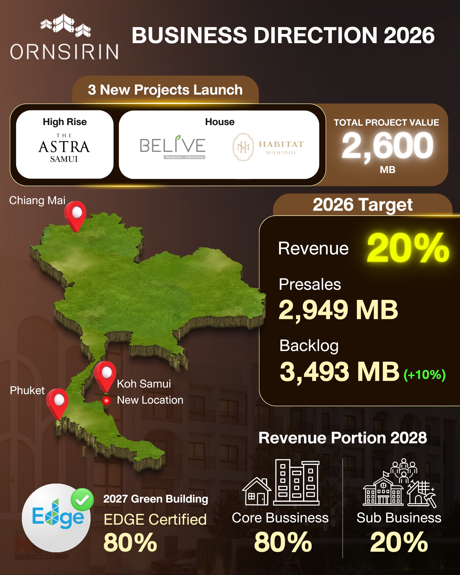 ORN กางแผนธุรกิจปี 2569 เปิด 3 โครงการใหม่มูลค่ารวม 2600 ล้านบาท รุกตลาด Blue Ocean "สมุย" ชูโครงการคุณภาพมาตรฐาน EDGE Green Building Certified เจาะกลุ่มเรียลดีมานด์ ต่างชาติ นักลงทุน มั่นใจกวาดยอดขายรวมไม่ต่ำกว่า 2949 ล้านบาท ลุยขยายพอร์ต Recurring Income โรงเรียนนานาชาติ คอมมูนิตี้มอลล์ ทรัพย์มือสอง บริหารต้นทุนรัดกุม คาดรายรวมปี 69 โต 20% ตั้งเป้าสัดส่วนรายได้ธุรกิจหลัก 80% ธุรกิจย่อย 20% ภายในปี 2571