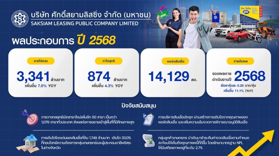 บมจ.ศักดิ์สยามลิสซิ่ง หรือ SAK ผู้ให้บริการสินเชื่อรายย่อย โชว์ความสำเร็จก้าวข้ามผ่านความท้าทายปี 2568 ผลงานสุดแกร่ง ทำรายได้รวม 3341 ล้านบาท เติบโต 7.0% มีกำไรสุทธิ 874 ล้านบาท เติบโต 4.3% เมื่อเทียบกับปีก่อน (YoY) ชูกลยุทธ์มุ่งสร้างการเติบโตจากคุณภาพ หนุนพอร์ตสินเชื่อยืนระยะอย่างมั่นคง 14129 ล้านบาท พร้อมคุม NPL อยู่หมัด ด้านบอร์ดอนุมัติจ่ายเงินปันผล 0.20 บาทต่อหุ้น ประกาศแผนปี 2569 เคียงข้างเกษตรกรไทยและประชาชนทั่วไป เตรียมพัฒนาผลิตภัณฑ์สินเชื่อและบริการใหม่ครบวงจร เร่งขยายฐานลูกค้าสินเชื่อปี 2569 รับคาดการณ์ดีมานด์ขยายตัว วางเป้าหมายดันพอร์ตสินเชื่อรวมพุ่งแตะ 15500-16000 ล้านบาท เติบโต 8-10%
