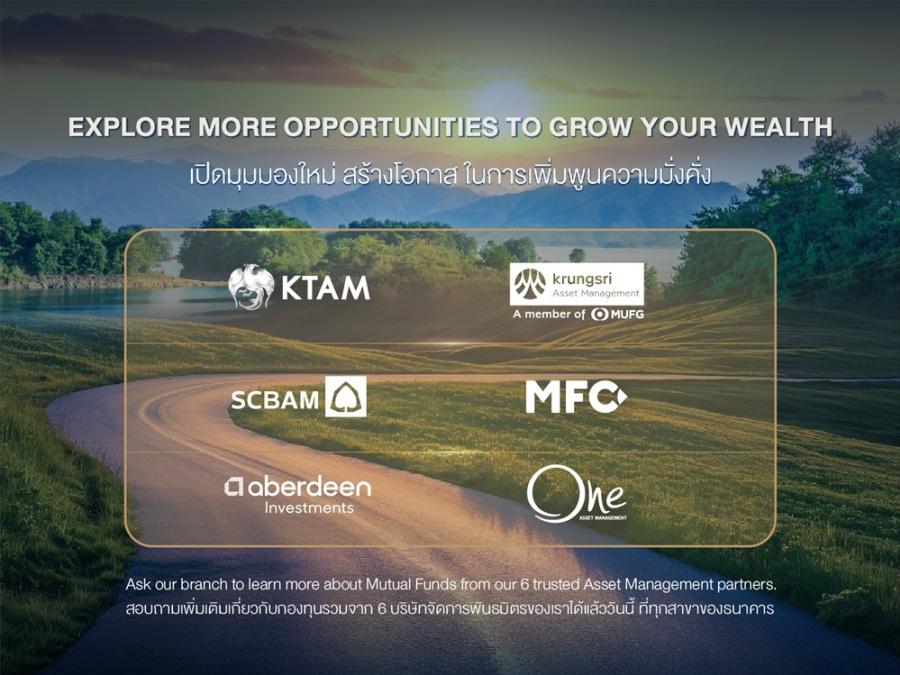 การผนึกกำลังกับ 6 บลจ. ชั้นนำ ได้แก่ บลจ. กรุงไทย จำกัด (มหาชน) (KTAM) บลจ. กรุงศรี จำกัด (KSAM) บลจ. ไทยพาณิชย์ จำกัด(SCBAM) บลจ. เอ็มเอฟซี จำกัด (มหาชน) (MFC) บลจ. อเบอร์ดีน (ประเทศไทย) จำกัด (ABRDN) และ บลจ. วรรณ จำกัด (ONEAM) จะช่วยให้ธนาคารสามารถนำเสนอผลิตภัณฑ์ที่ครอบคลุมทุกความต้องการ อาทิ กองทุนตราสารทุน กองทุนรวมตราสารหนี้ กองทุนรวมผสม และกองทุนต่างประเทศ ให้ลูกค้าเข้าถึงสินทรัพย์ได้ครอบคลุม พร้อมบริการดูแลอย่างใกล้ชิดจากที่ปรึกษาการลงทุนมืออาชีพ