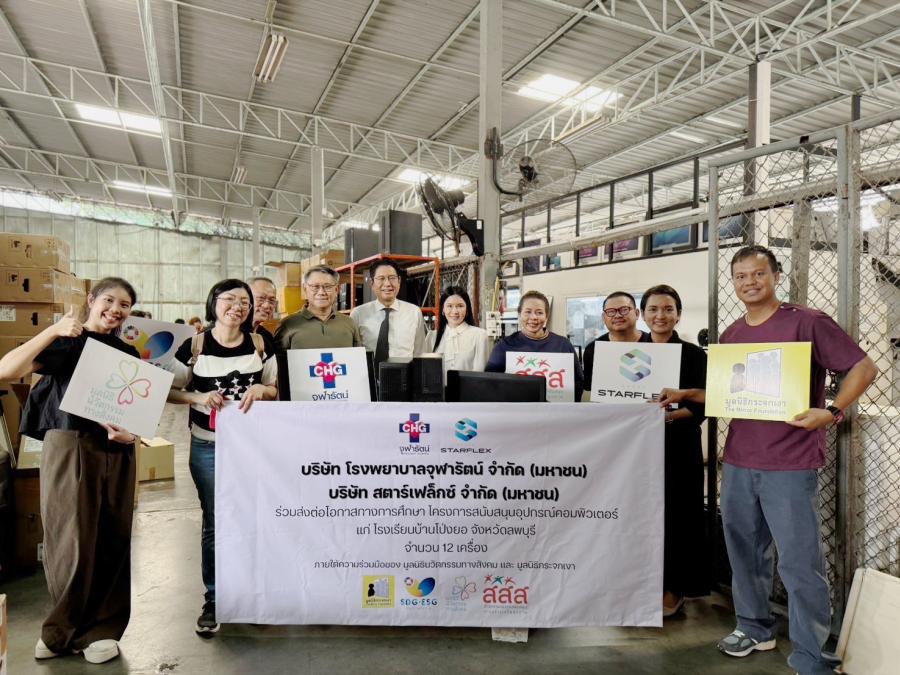 คุณสมโภชน์ วัลยะเสวี ประธานเจ้าหน้าที่บริหาร (ที่5จากซ้าย) บริษัท สตาร์เฟล็กซ์ จำกัด (มหาชน) หรือ SFLEX พร้อมด้วย คุณอภิชาติ การุณกรสกุล (ที่4จากซ้าย) ประธานมูลนิธินวัตกรรมทางสังคม ร่วมกับ บริษัท โรงพยาบาลจุฬารัตน์ จำกัด (มหาชน) และมูลนิธิกระจกเงา เดินหน้าส่งเสริมการศึกษาและพัฒนาศักยภาพเยาวชนไทย ผ่านโครงการสนับสนุนอุปกรณ์คอมพิวเตอร์ จำนวน 12 เครื่อง ให้แก่โรงเรียนบ้านโป่งยอ จังหวัดลพบุรี เพื่อยกระดับคุณภาพการเรียนรู้ การศึกษา ทั้งในด้านดิจิทัล สื่อออนไลน์ รวมไปถึงการประยุกต์ใช้เทคโนโลยีอย่างสร้างสรรค์ ซึ่งจะช่วยให้นักเรียนสามารถเข้าถึงแหล่งความรู้ได้อย่างรวดเร็ว และมีประสิทธิภาพ