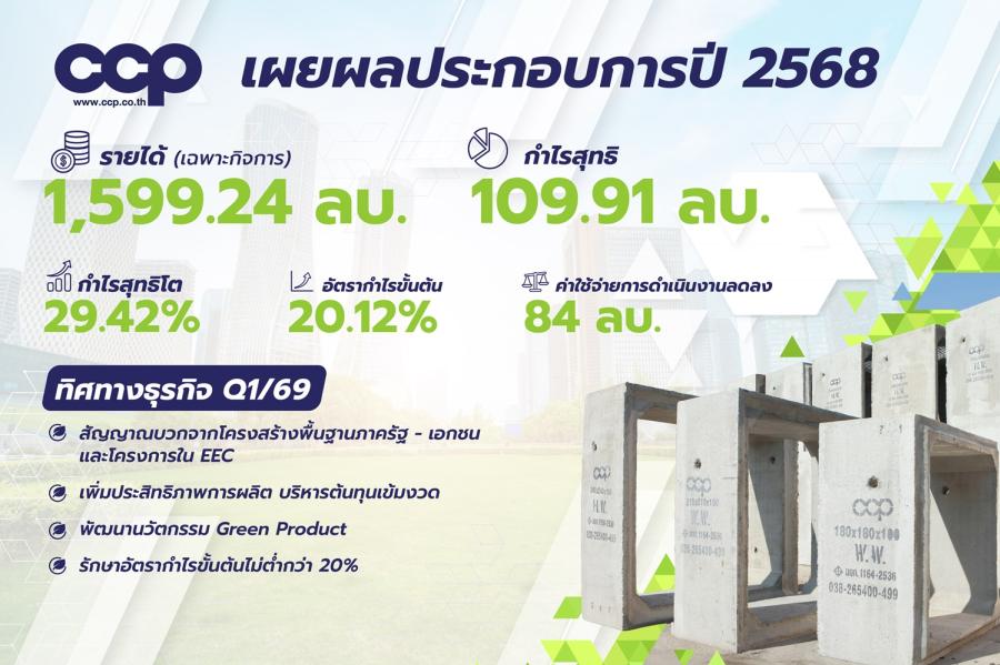 CCP เผยงบเฉพาะกิจการปี 2568 รายได้รวม 1599.24 ล้านบาท กำไรสุทธิ 109.91 ล้านบาท โต 29.42% งบรวมปี 2568 รายได้ 2552.77 ล้านบาท กำไร 95.49 ล้านบาท อานิสงส์งานโครงสร้างพื้นฐานภาครัฐเร่งตัว คาดไตรมาส 1/69 การลงทุนภาครัฐ พัฒนาพื้นที่ EEC หนุนการเติบโตต่อ รุกผลิตภัณฑ์คอนกรีต Green Product ตอบโจทย์โครงการเมกะโปรเจกต์ เพิ่มประสิทธิภาพการผลิต ควบคุมต้นทุนเข้ม รักษาอัตรากำไรขั้นต้นระดับ 20%