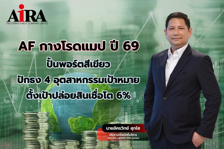 บมจ.ไอร่า แฟคตอริ่ง (AF) พร้อมขยับตัวสู่ ’Finance for Future’ ตั้งเป้าพอร์ตปี 69 โต 6% มุ่งเน้นขยายพอร์ตกลุ่ม ESG Finance และ Green Loan ตอบโจทย์ภาคธุรกิจที่ต้องการ ทรานส์ฟอร์มสู่ความยั่งยืน พร้อมเร่งวางกลยุทธ์ขยาย 4 พอร์ตกลุ่มอุตสาหกรรม “อาหารและเครื่องดื่ม บริการและอุปกรณ์ทางการแพทย์ ผู้ผลิตชิ้นส่วนรถยนต์ และอุปกรณ์สารสนเทศ (IT)” หวังช่วยต่อยอดขีดความสามารถทางการแข่งขัน SMEs ไทย