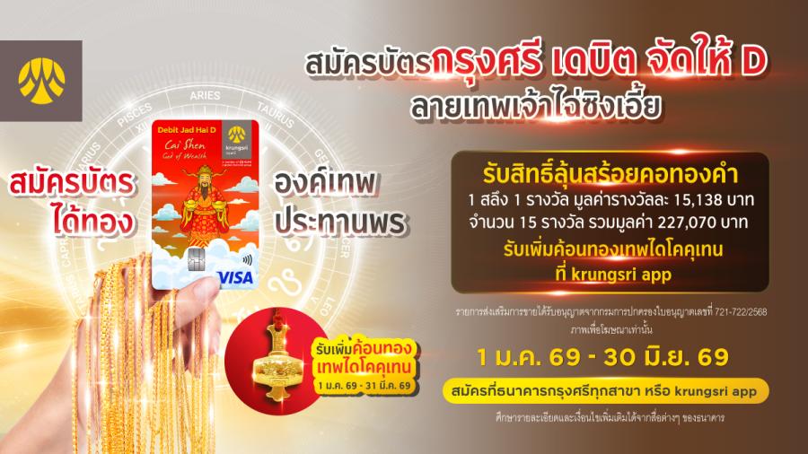 กรุงศรี (ธนาคารกรุงศรีอยุธยา จำกัด (มหาชน)) มอบสิทธิพิเศษสำหรับลูกค้าที่สมัครบัตรกรุงศรี เดบิต จัดให้ D ลายเทพเจ้าไฉ่ซิงเอี้ยที่ธนาคารกรุงศรีอยุธยา ทุกสาขา หรือผ่าน krungsri app รับสิทธิ์เพื่อลุ้นรับสร้อยคอทองคำ 1 สลึง จำนวน 15 รางวัล รวมมูลค่า 227070 บาท ตั้งแต่วันที่ 1 มกราคม – 30 มิถุนายน 2569 และรับเพิ่มค้อนทองเทพไดโคคุเทน เสริมโชคลาภ จากวัดเซนโซจิ ประเทศญี่ปุ่น มูลค่า 500 บาท เมื่อสมัครบัตรกรุงศรี เดบิต จัดให้ D ลายเทพเจ้าไฉ่ซิงเอี้ย ผ่านธนาคารกรุงศรีอยุธยาทุกสาขา หรือ ผ่าน krungsri app ในระหว่างวันที่ 1 มกราคม 2569 – 31 มีนาคม 2569 โดยสามารถกดรับสิทธิ์ได้ที่ krungsri app ที่เมนูสิทธิประโยชน์