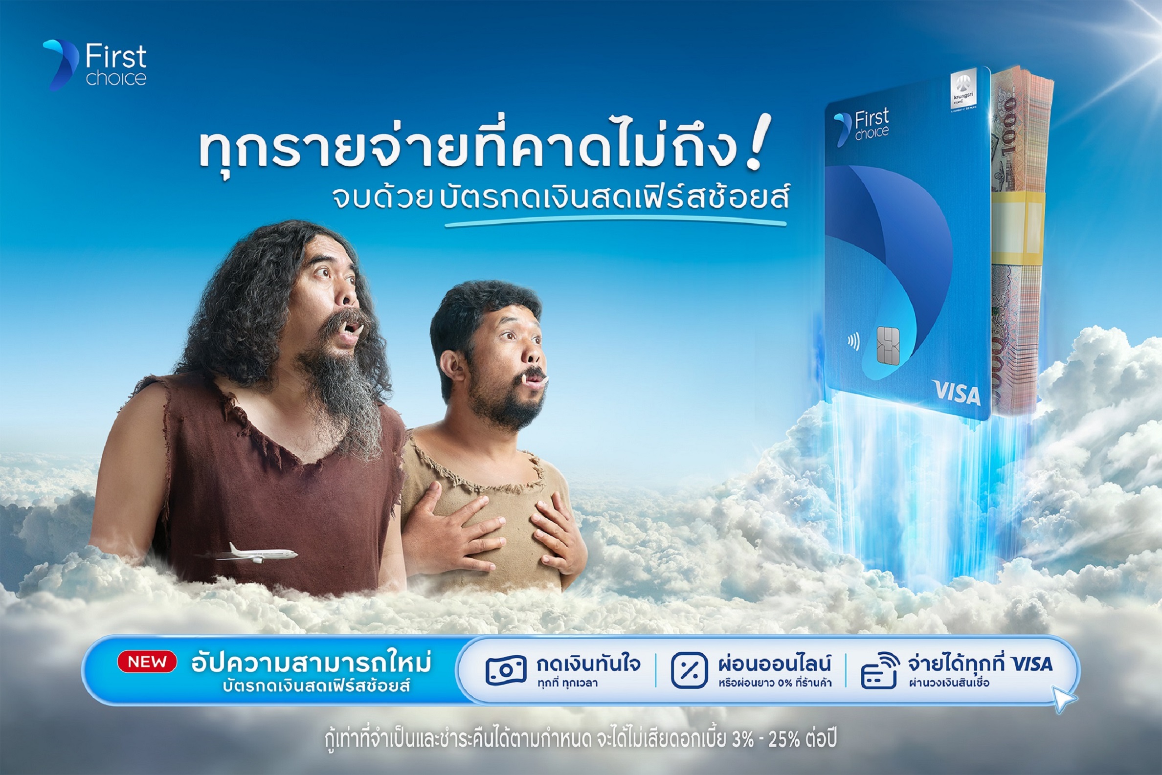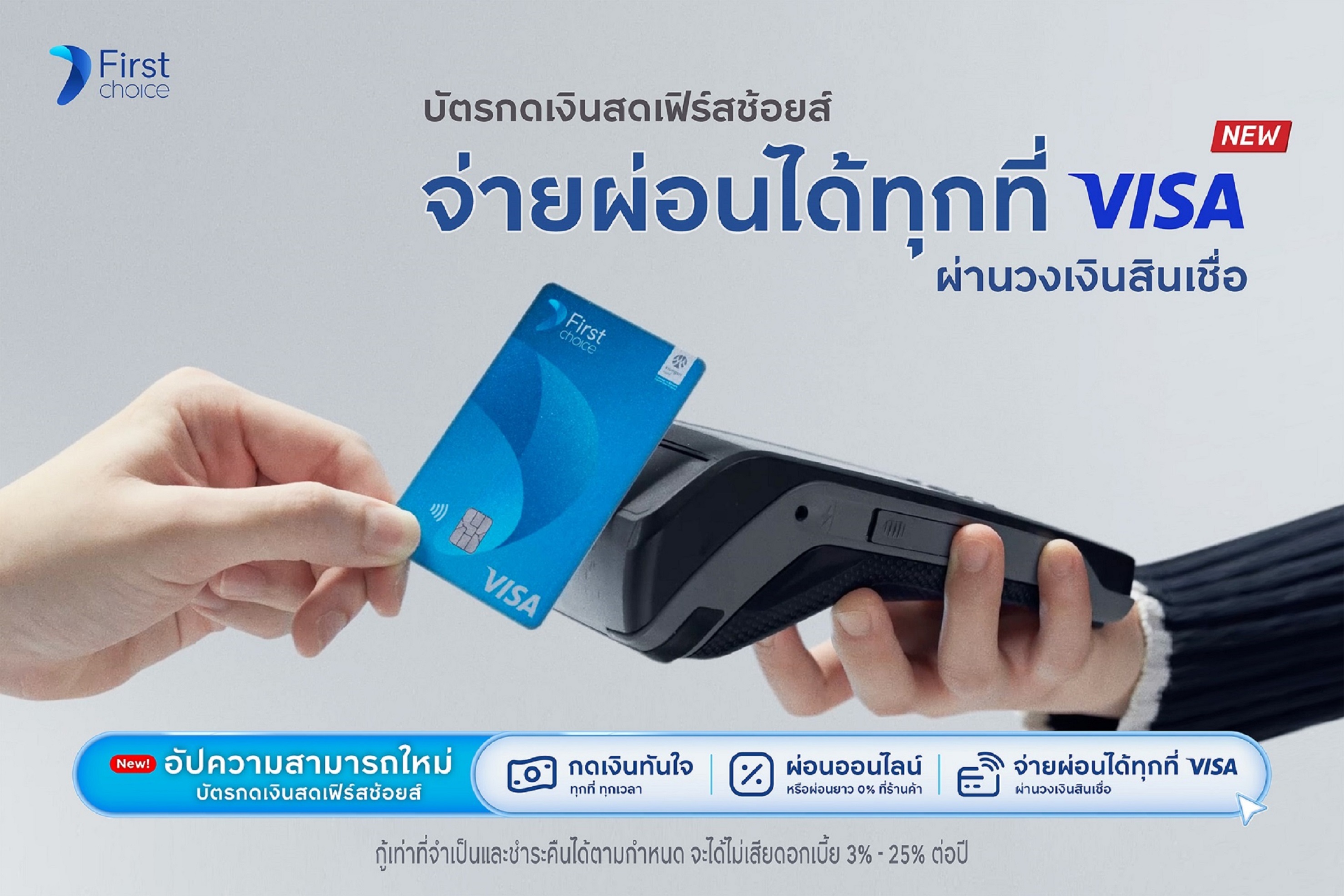 บัตรกดเงินสดเฟิร์สช้อยส์โฉมใหม่โดดเด่นด้วยนวัตกรรมการชำระเงินที่อัปความสามารถไปอีกขั้น เพิ่มความสะดวก ตอบโจทย์ไลฟ์สไตล์การใช้จ่ายยุคใหม่ รองรับทุกรายจ่ายที่คาดไม่ถึงด้วยบริการหลากหลายในบัตรเดียว ทั้งกดเงินทันใจ ทุกที่ ทุกเวลา ผ่านแอป UCHOOSE หรือผ่านตู้ ATM และบริการผ่อนยาว 0% ที่ร้านค้าพันธมิตรแบรนด์ดังมากกว่า 20000 ร้านทั่วประเทศ และบริการใหม่ จ่ายผ่อนได้ทุกที่ที่มีสัญลักษณ์ VISA ผ่านวงเงินสินเชื่อ และผ่อนออนไลน์ได้บนแพลตฟอร์มออนไลน์ชั้นนำ มั่นใจกับระบบ VISA 3D Secure เพิ่มความปลอดภัยกับทุกการใช้จ่ายออนไลน์ สมัครง่ายผ่านแอปพลิเคชัน UCHOOSE หรือผ่านเว็บไซต์ First Choice หรือยื่นเอกสาร อนุมัติ รับบัตรทันใจที่สาขาเฟิร์สช้อยส์ทั่วประเทศ รู้ผลอนุมัติ ได้ไวใน 30 นาที พิเศษ! สำหรับลูกค้าที่สมัคร ‘บัตรกดเงินสดเฟิร์สช้อยส์’ ใหม่ ตั้งแต่ 1 มีนาคม 2569 – 30 มิถุนายน 2569 เมื่อสมัครบัตรฯ และผ่านการอนุมัติ รับสิทธิ์เบิกถอนเงินสด ไม่มีดอกเบี้ย 0% นานสูงสุดถึง 45 วัน และรับของสมนาคุณมูลค่าสูงสุด 4590 บาท (เงื่อนไขเป็นไปตามที่กำหนด)