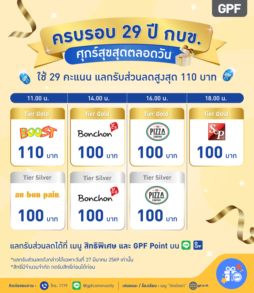 สำหรับกิจกรรมพิเศษในโอกาสครบรอบ 29 ปีนี้ กบข. เปิดให้สมาชิกใช้คะแนน GPF Point เพียง 29 คะแนน แลกรับส่วนลดจากร้านค้าอาหารและเครื่องดื่มชั้นนำ อาทิ บูสท์จูซบาร์ บอนชอน เดอะ พิซซ่า คอมปะนี และ เอสแอนด์พี รวมกว่า 3200 รางวัล เฉพาะวันที่ 27 มีนาคม 2569 เท่านั้น พร้อมกิจกรรม Quiz on LINE ผ่าน LINE @gpfcommunity ที่เปิดให้สมาชิกร่วมตอบคำถามวันละครั้ง โดยคำถามครอบคลุมความรู้เกี่ยวกับ กบข. ทั้งด้านการออม การลงทุน บริการ My Digital Twins และสิทธิประโยชน์ต่างๆ เพื่อช่วยเสริมความเข้าใจและการวางแผนทางการเงินของสมาชิก และยังได้ลุ้นรับของรางวัลรวมกว่า 200000 รางวัล เช่น ส่วนลดบิ๊กซี แดรี่ควีน และคะแนน GPF Point 10–20 คะแนน สมาชิกร่วมสนุกได้ตั้งแต่วันที่ 27 มีนาคม – 25 เมษายน 2569 สอบถามข้อมูลเพิ่มเติมได้ที่ Facebook กบข. หรือ LINE @gpfcommunity หรือศูนย์บริการข้อมูลสมาชิก โทร 1179