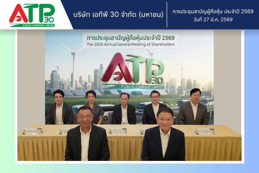 นายชาติชาย พานิชชีวะ (ขวา) ประธานกรรมการ นายปิยะ เตชากูล (ซ้าย) ประธานเจ้าหน้าที่บริหาร พร้อมด้วยคณะกรรมการและผู้บริหาร บมจ. เอทีพี 30 (ATP 30) จัดงานประชุมสามัญผู้ถือหุ้นประจำปี 2569 โดยที่ประชุมมีมติอนุมัติจ่ายเงินปันผลงวดปี 2568 จำนวน 0.04 บาทต่อหุ้น หรือ 46.65% ของกำไรสุทธิฯ กำหนด Record Date 8 เม.ย 2569 และจ่ายปันผล 24 เม.ย.2569 ณ ชีวาทัย ฮอลล์มาร์ค เอกมัย-รามอินทรา เมื่อเร็วๆนี้