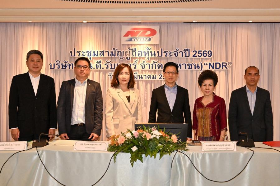 นายชัยสิทธิ์ สัมฤทธิวณิชชา (ที่ 4 จากซ้าย) กรรมการผู้จัดการ พร้อมด้วยคณะกรรมการบริษัท เอ็น.ดี. รับเบอร์ จำกัด (มหาชน) หรือ NDR ผู้ผลิตและจำหน่ายยางนอกและยางในรถจักรยานยนต์ภายใต้แบรนด์ N.D. Rubber ร่วมถ่ายภาพภายหลังเสร็จสิ้นการประชุมสามัญผู้ถือหุ้นประจำปี 2569 โดยที่ประชุมผู้ถือหุ้นมีมติอนุมัติทุกวาระที่คณะกรรมการเสนอเป็นเอกฉันท์ รวมถึงการอนุมัติงบการเงินประจำปี 2568 และวาระสำคัญอื่นๆ ทุกวาระ