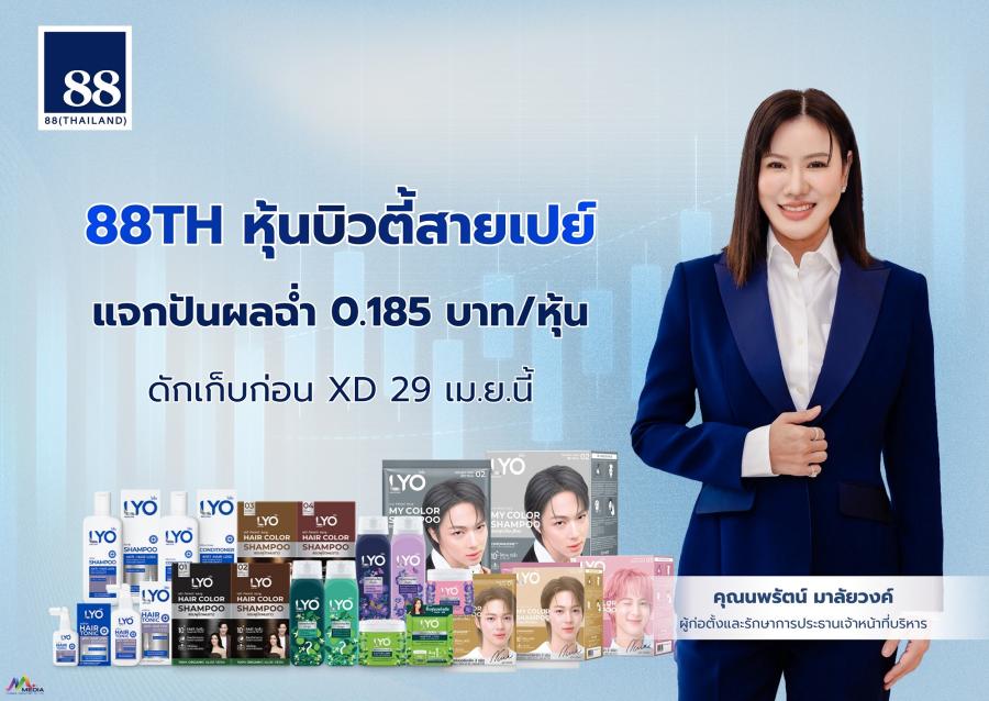 ใครที่กำลังมองหาหุ้นพื้นฐานแน่น สตอรี่เริ่ด แถมปันผลปังๆ นาทีนี้ถ้าไม่พูดถึงหุ้นบิวตี้ตัวตึงอย่าง บมจ.88 (ไทยแลนด์) หรือ 88TH ถือว่าตกขบวน เพราะ 29 เม.ย.นี้ จ่อขึ้นเครื่องหมาย XD เตรียมแจกเงินสดเข้ากระเป๋าผู้ถือหุ้นเน้นๆ 0.185 บาท/หุ้น จ่ายจริงวันที่ 19 พ.ค. นี้แล้วจ้า... ใครยังไม่มีติดพอร์ตระวังจะคุยกับเขาไม่รู้เรื่อง แต่ข่าวดียังไม่หมดแค่นั้น เพราะแว่วมาว่าพนักงานแพ็คของกันมือเป็นระวิงหลังปล่อยไม้เด็ดเขย่าตลาดแชมพูเปลี่ยนสีผม “LYO MY COLOR SHAMPOO” ที่นอกจากจะสีสวยติดทนแล้ว ยังคว้าตัวพรีเซ็นเตอร์ไอดอลแนวหน้า “นุนิว - ชวรินทร์” มานั่งแท่นพรีเซ็นเตอร์ ยิ่งดันยอดขายพุ่งปรี๊ด ด้านบอสสาวคนเก่ง “คุณนพรัตน์ มาลัยวงค์” ส่งซิกมาว่านี่แค่เรียกน้ำย่อยนะคะ เพราะ 88TH ยังมีไม้ตายรอปล่อยอีกเพียบ แถมตอนนี้กำลังเร่งเครื่องเดินเกมรุก บุกตลาดแดนมังกรเต็มสูบเพื่อโกยเงินหยวนกลับไทย มั่นใจเป้าหมายรายได้รวมปีนี้โตทะยาน 30% (YoY) แบบชิลๆ แน่นอน แหม... ได้ยินแบบนี้แล้ว ยกให้เป็นหุ้นเด่น ธุรกิจสตรอง ปันผลเริ่ดไปเลย