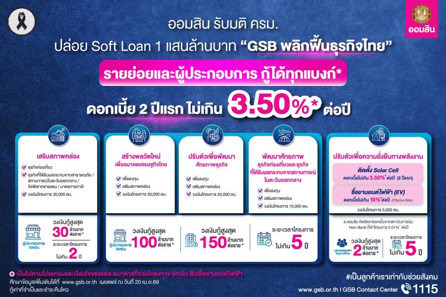 นายทรงพล ชีวะปัญญาโรจน์ ผู้อำนวยการธนาคารออมสิน เปิดเผยว่า ตามมติคณะรัฐมนตรี เมื่อวันที่ 11 เมษายน 2569 เห็นชอบการออกมาตรการดูแลผู้ที่ได้รับผลกระทบจากสถานการณ์วิกฤตพลังงาน ความไม่แน่นอนทางเศรษฐกิจและความขัดแย้งในต่างประเทศ โดยมอบหมายให้ธนาคารออมสินเป็นแกนหลักในการขับเคลื่อนมาตรการทางการเงินเพื่อเติมสภาพคล่องผ่าน โครงการสินเชื่อดอกเบี้ยต่ำ (Soft Loan) “GSB พลิกฟื้นธุรกิจไทย” วงเงิน 100000 ล้านบาท มุ่งช่วยประชาชนและผู้ประกอบการ SMEs ปรับตัวรับมือวิกฤตที่ส่งผลกระทบต่อการดำรงชีวิตและการดำเนินธุรกิจ พร้อมสนับสนุนการเปลี่ยนผ่านสู่การใช้พลังงานทางเลือก โดยความร่วมมือของธนาคารพาณิชย์และสถาบันการเงินเฉพาะกิจทั้ง 16 แห่ง ในการส่งผ่านเงินทุนดอกเบี้ยต่ำไปยังกลุ่มเป้าหมายให้เร็วที่สุด