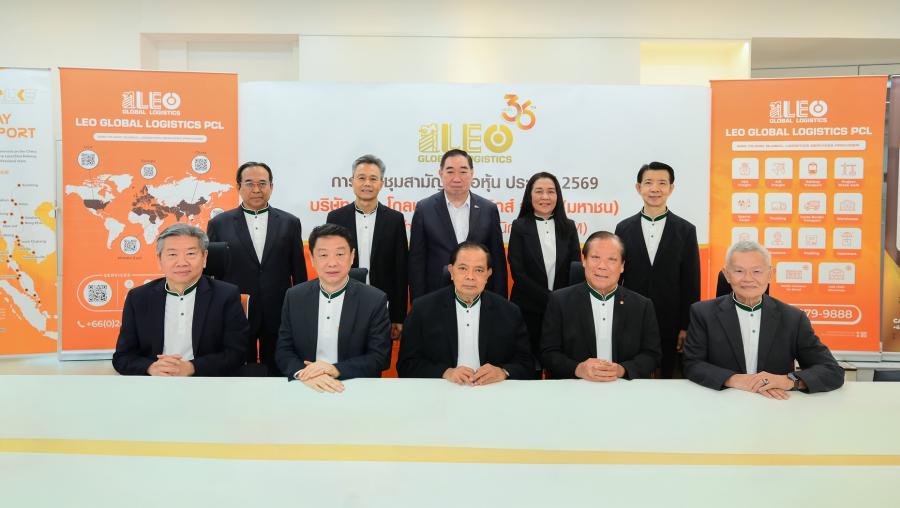 นายเสนีย์ แดงวัง (แถวนั่ง กลาง) ประธานคณะกรรมการบริษัท และนายเกตติวิทย์ สิทธิสุนทรวงศ์ (แถวนั่งที่ 2 จากซ้าย) ประธานเจ้าหน้าที่บริหาร พร้อมด้วยคณะกรรมการบริษัทและผู้บริหาร บริษัท ลีโอ โกลบอล โลจิสติกส์ จำกัด (มหาชน) หรือ LEO ถ่ายภาพร่วมกันภายหลังการประชุมสามัญผู้ถือหุ้นประจำปี 2569 ผ่านระบบสื่ออิเล็กทรอนิกส์ (E-AGM) โดยที่ประชุมมีมติอนุมัติการจ่ายเงินปันผลงวดปี 2568 เป็นเงินสดในอัตรา 0.06 บาทต่อหุ้น คิดเป็นเงินจ่ายปันผลรวม 18.90 ล้านบาท กำหนดจ่ายวันที่ 8 พฤษภาคม 2569 พร้อมเดินหน้าตามแผนยุทธศาสตร์การเติบโต 3 ด้าน 6 มิติ (3x6 Growth Matrix) และ Jump เพื่อสร้างการเติบโตของ EBITDA เพิ่มขึ้น 45% หรือ 50-55 ล้านบาท ภายในปี 2571 ลุยต่อยอดธุรกิจ Non Freight ผลักดันศักยภาพโลจิสติกส์ครบวงจร และงานดังกล่าวจัดขึ้น ณ ห้องประชุมบริษัทฯ เมื่อเร็ว ๆ นี้