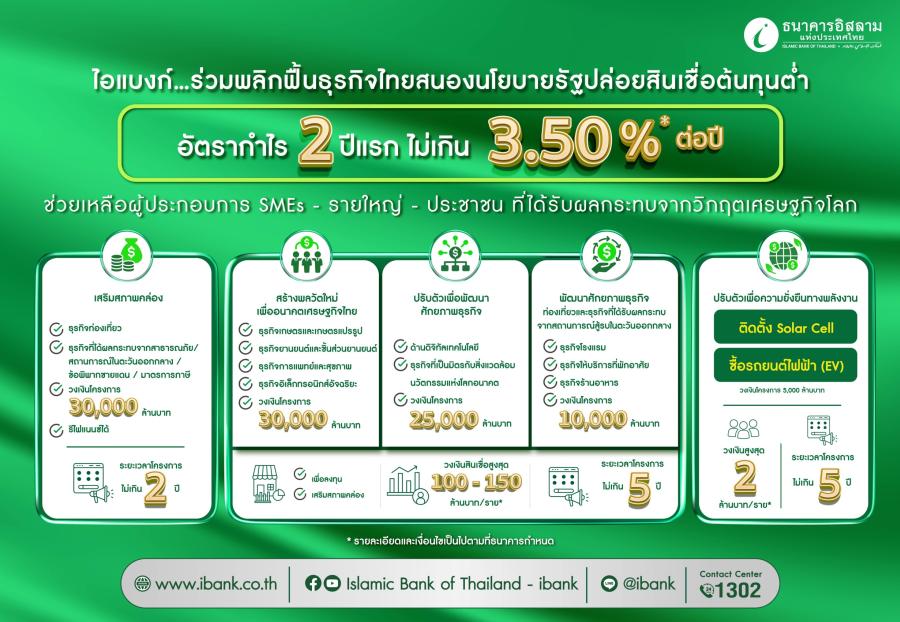 ธนาคารอิสลามแห่งประเทศไทย (ไอแบงก์) ขานรับมติคณะรัฐมนตรี วันที่ 11 เมษายน 2569 เข้าร่วมโครงการปล่อยสินเชื่อต้นทุนต่ำ (Soft Loan) GSB พลิกฟื้นธุรกิจไทย วงเงินรวม 100000 ล้านบาท เพื่อเสริมสภาพคล่องและกระตุ้นการหมุนเวียนทางเศรษฐกิจ โดยเปิดโอกาสให้ผู้ประกอบการและประชาชนสามารถเข้าถึงแหล่งเงินทุน เริ่มต้นอัตรากำไร 2 ปีแรกไม่เกิน 3.50% ต่อปี