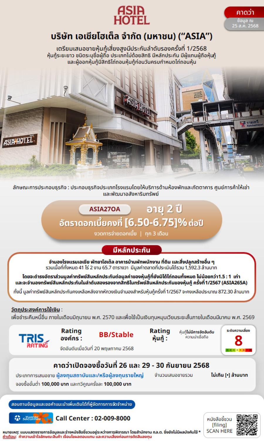 บมจ.เอเชียโฮเต็ล (ASIA) เดินหน้าระดมทุนรอบใหม่ ออกหุ้นกู้มีหลักประกัน อายุ 2 ปี อัตราดอกเบี้ย 6.50–6.75% ต่อปี เปิดจอง 26 29–30 ก.ย. นี้ เสนอขายนักลงทุนสถาบันและรายใหญ่ พร้อมค้ำประกันด้วยทรัพย์สินโรงแรมเอเชียพัทยาและที่ดินรวมมูลค่า 1592.3 ล้านบาท วัตถุประสงค์การออกหุ้นกู้ในครั้งนี้ เพื่อใช้เพื่อชำระคืนหนี้ และเป็นเงินหมุนเวียน พร้อมเพิ่มประสิทธิภาพการบริหารสภาพคล่องทางการเงิน ฟากผู้บริหาร "พัชรพล เตชะหรูวิจิตร" ระบุมั่นใจได้รับการตอบรับดีต่อเนื่อง หลังการออกหุ้นกู้ครั้งแรกปี 67 ปิดจองเต็มวงเงินทันที