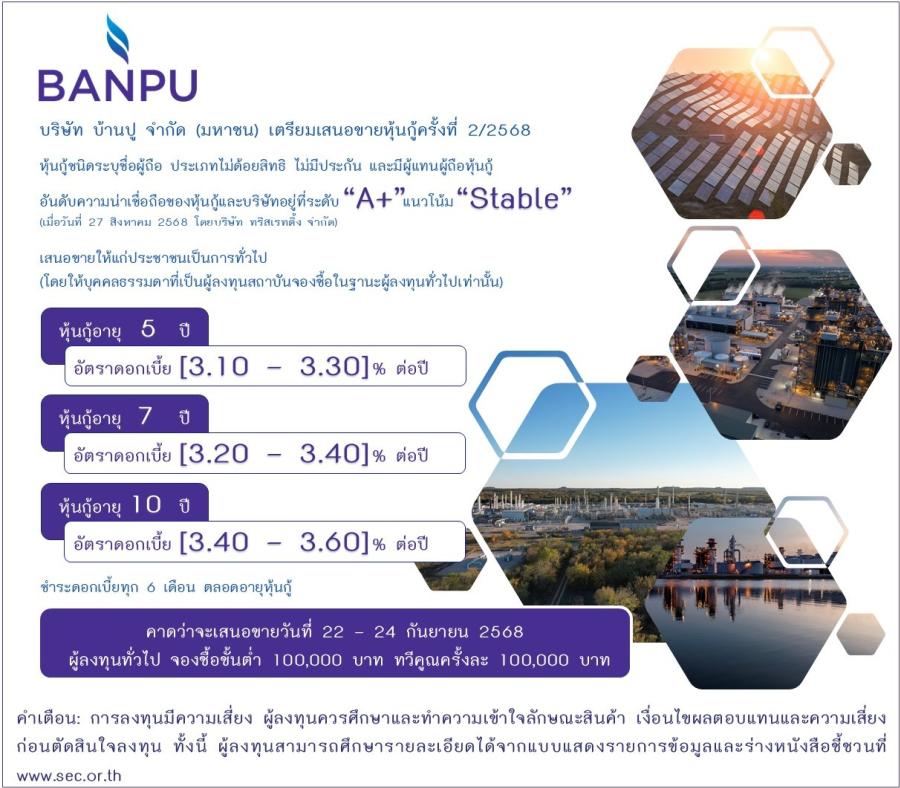 บริษัท บ้านปู จำกัด (มหาชน) ผู้นำด้านพลังงานที่หลากหลาย เตรียมออกและเสนอขายหุ้นกู้ให้แก่ประชาชนเป็นการทั่วไป (Public Offering) จำนวน 3 ชุด ผ่าน 7 สถาบันการเงินชั้นนำ โดยหุ้นกู้ได้รับการจัดอันดับเครดิตจากทริสเรทติ้งที่ระดับ “A ” แนวโน้ม “คงที่” เมื่อวันที่ 27 สิงหาคม พ.ศ. 2568